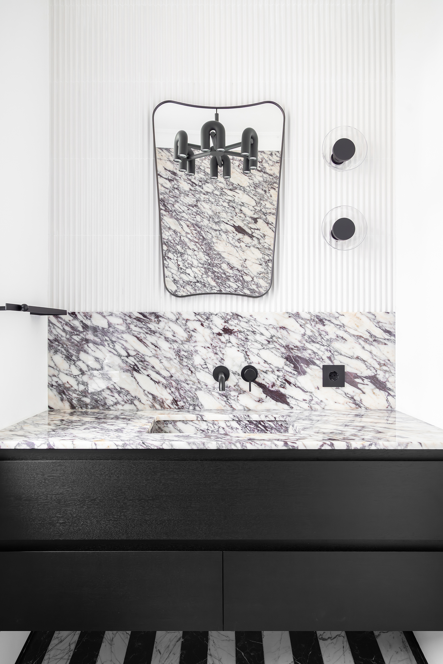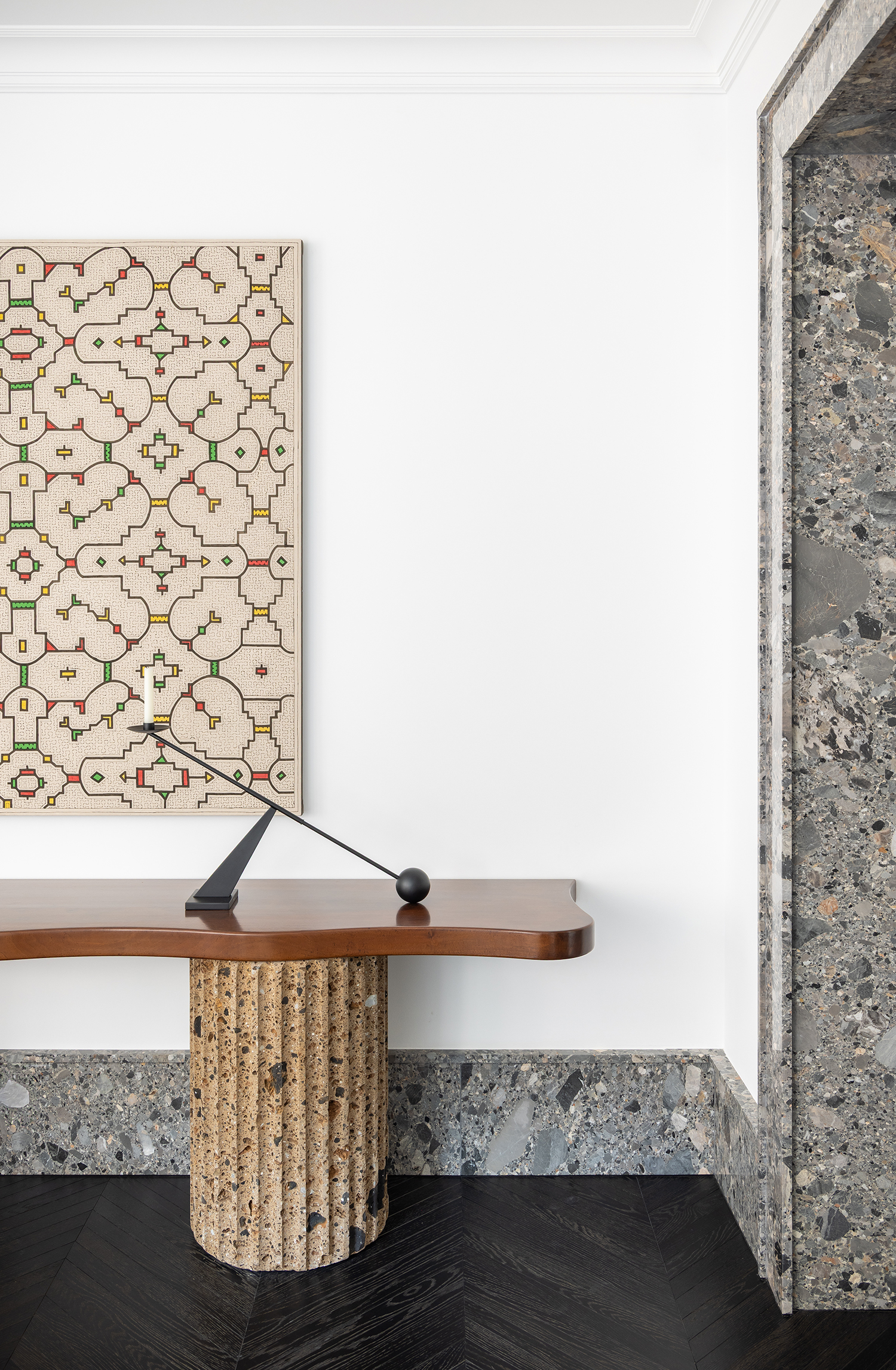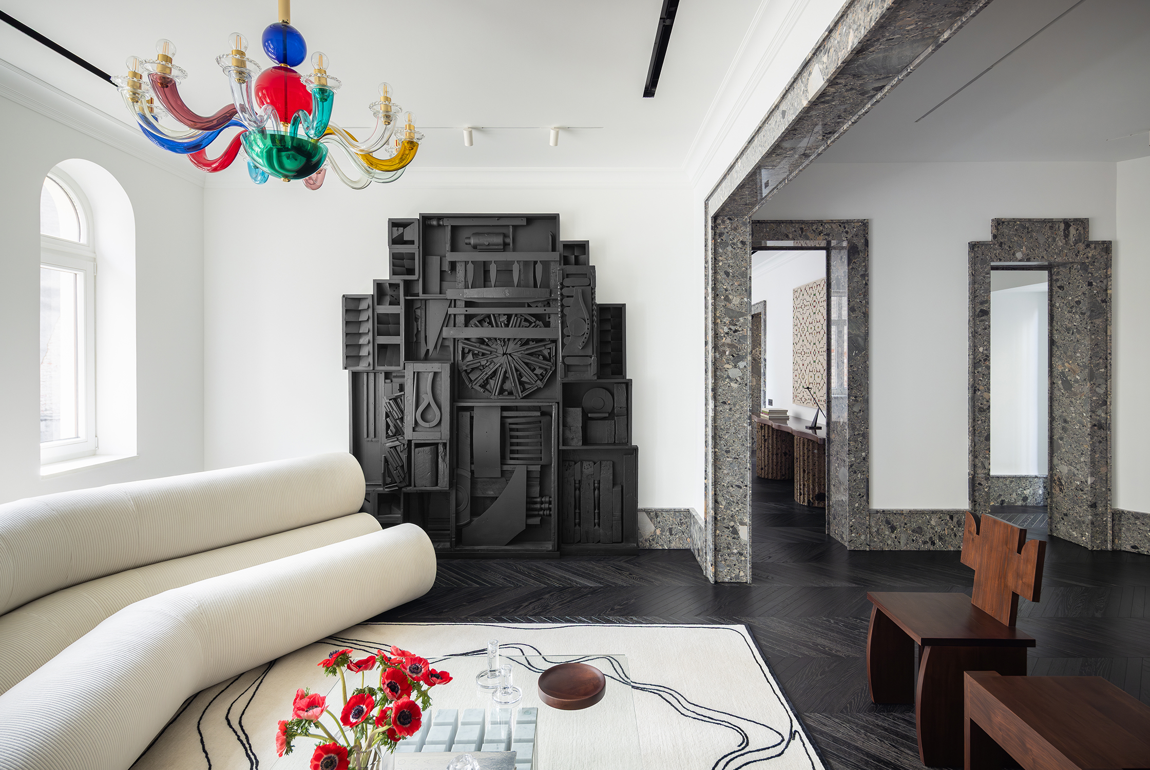 Furniture and lighting were curated as sculptural extensions of the architecture—functional yet expressive—supporting the gallery-like quality of the space while maintaining domestic warmth. Even secondary spaces were treated with curatorial intent: in the guest powder room, an unused shower alcove was transformed into a display niche, turning a purely functional zone into an intimate exhibition moment.
