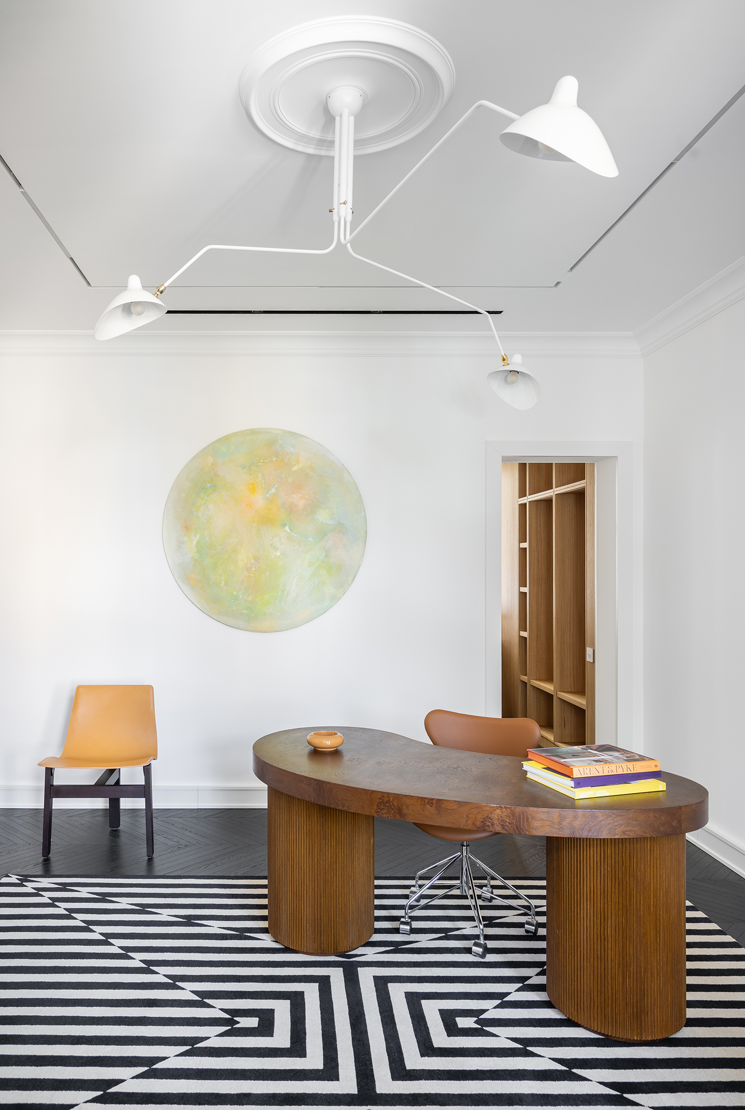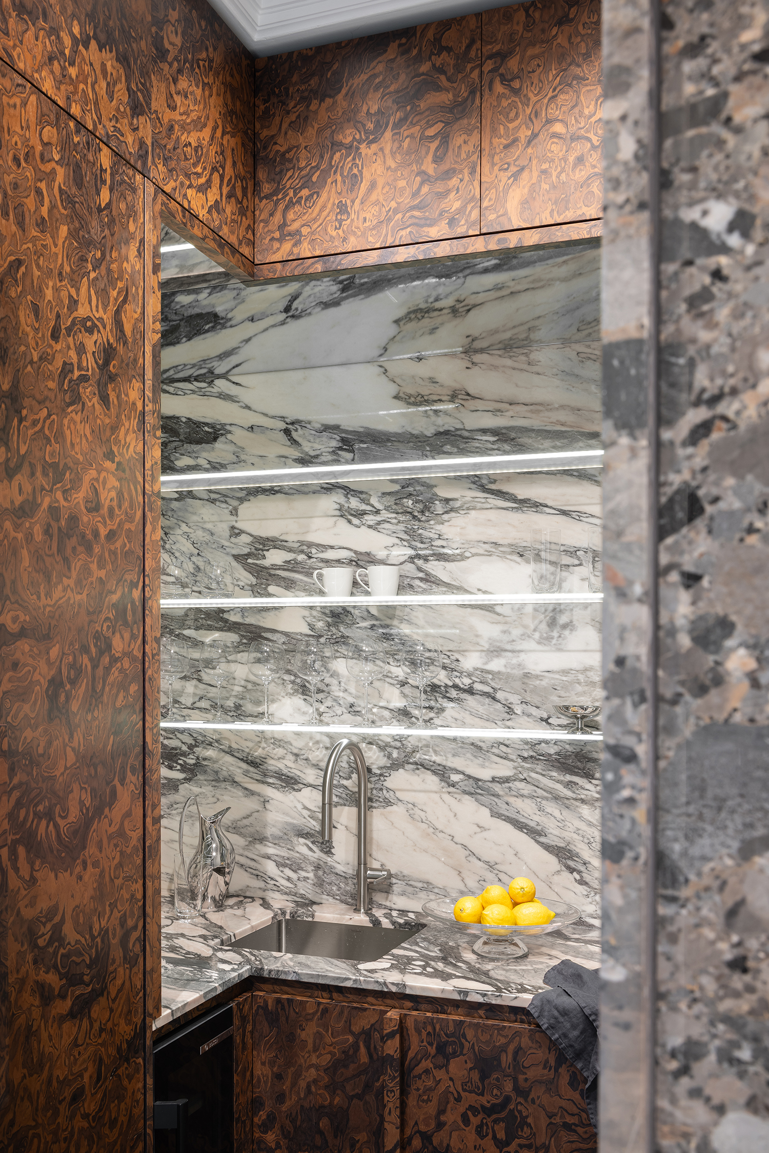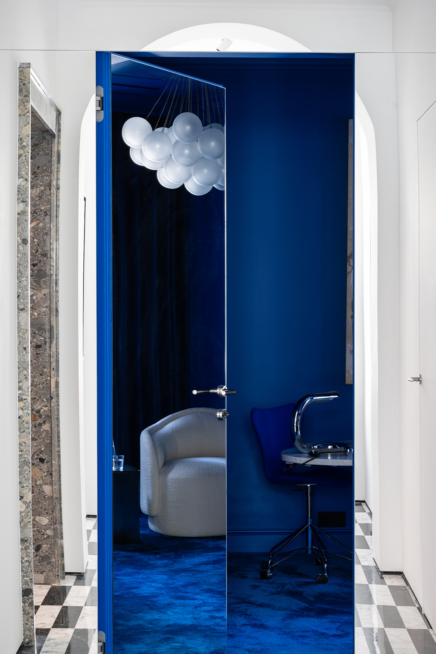 Furniture and lighting were curated as sculptural extensions of the architecture—functional yet expressive—supporting the gallery-like quality of the space while maintaining domestic warmth. Even secondary spaces were treated with curatorial intent: in the guest powder room, an unused shower alcove was transformed into a display niche, turning a purely functional zone into an intimate exhibition moment.