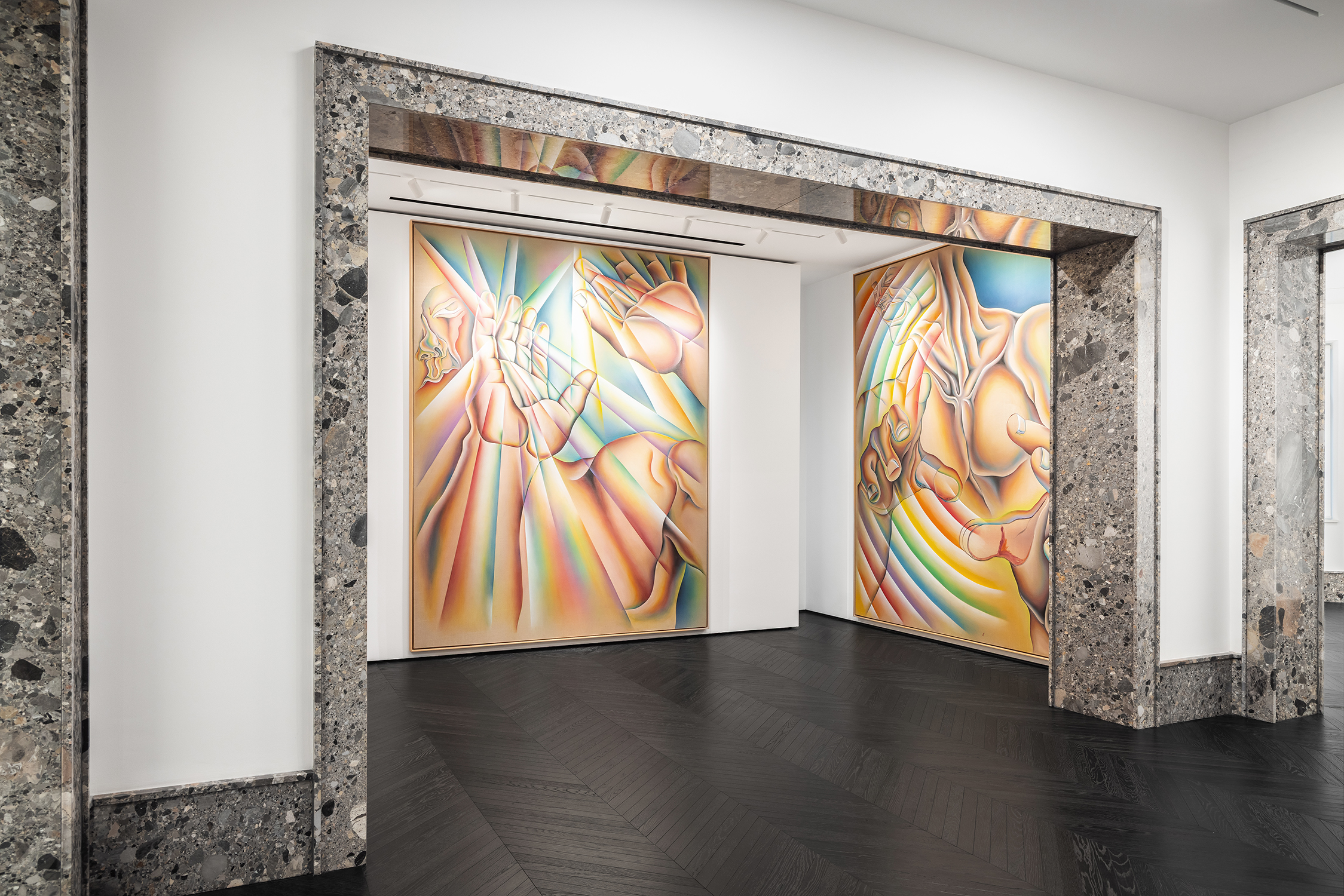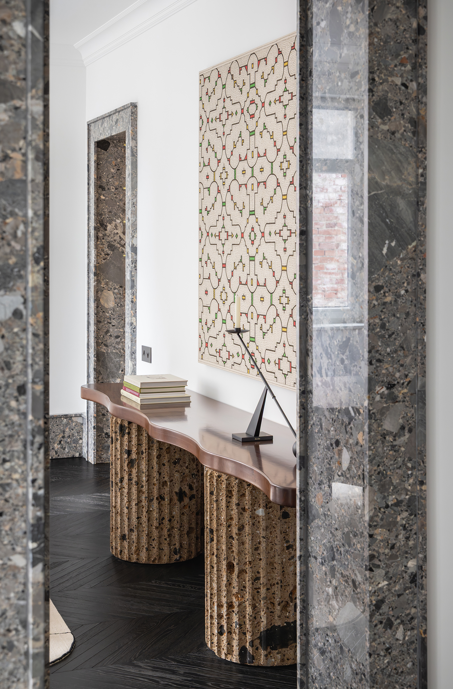 Material choices reinforced the atmosphere of quiet gravitas. Ceppo di Gré stone frames thresholds and openings, dark herringbone floors ground the luminous palette, and marble appears selectively, most notably in a monolithic dining table. Subtle brass and muted gold accents introduce depth without disrupting the overall calm.