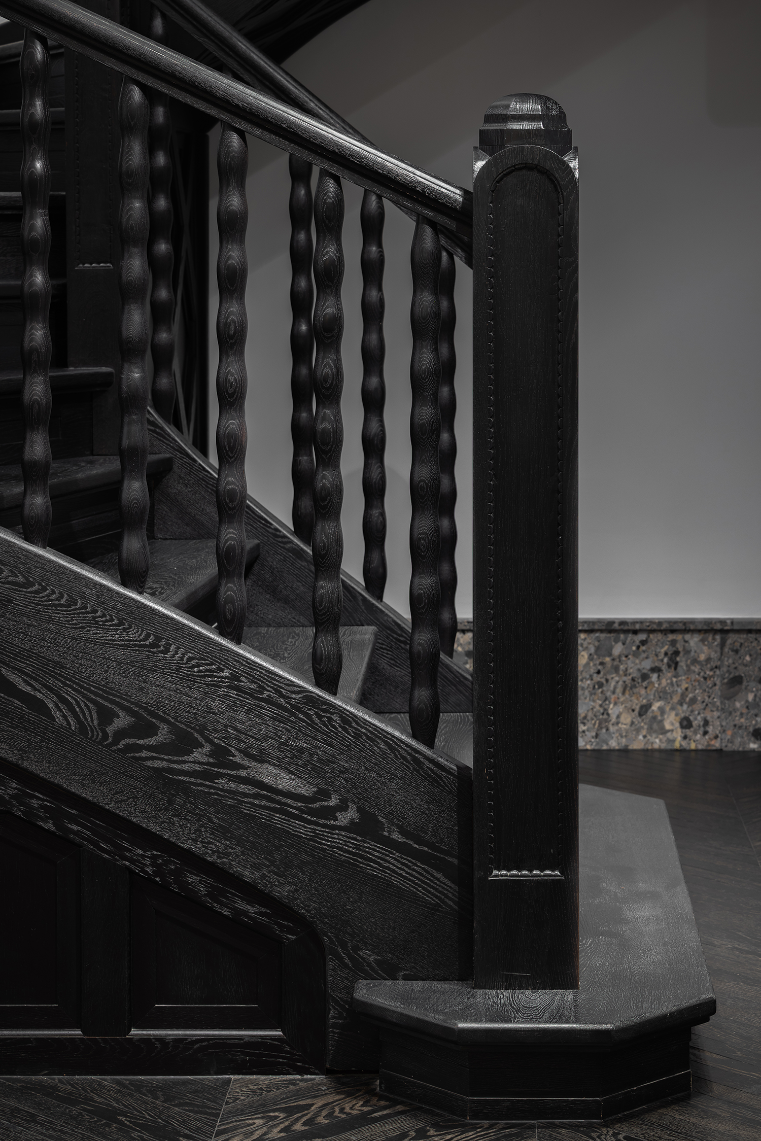 Three key elements were preserved and restored to anchor the building’s historical continuity: the façade and two staircases. The central wooden staircase was fully restored to reclaim its role as the home’s vertical spine, while the secondary concrete and terrazzo staircase was cleaned and polished, retaining its original integrity. Together, they embody the project’s approach—integrating time rather than erasing it.