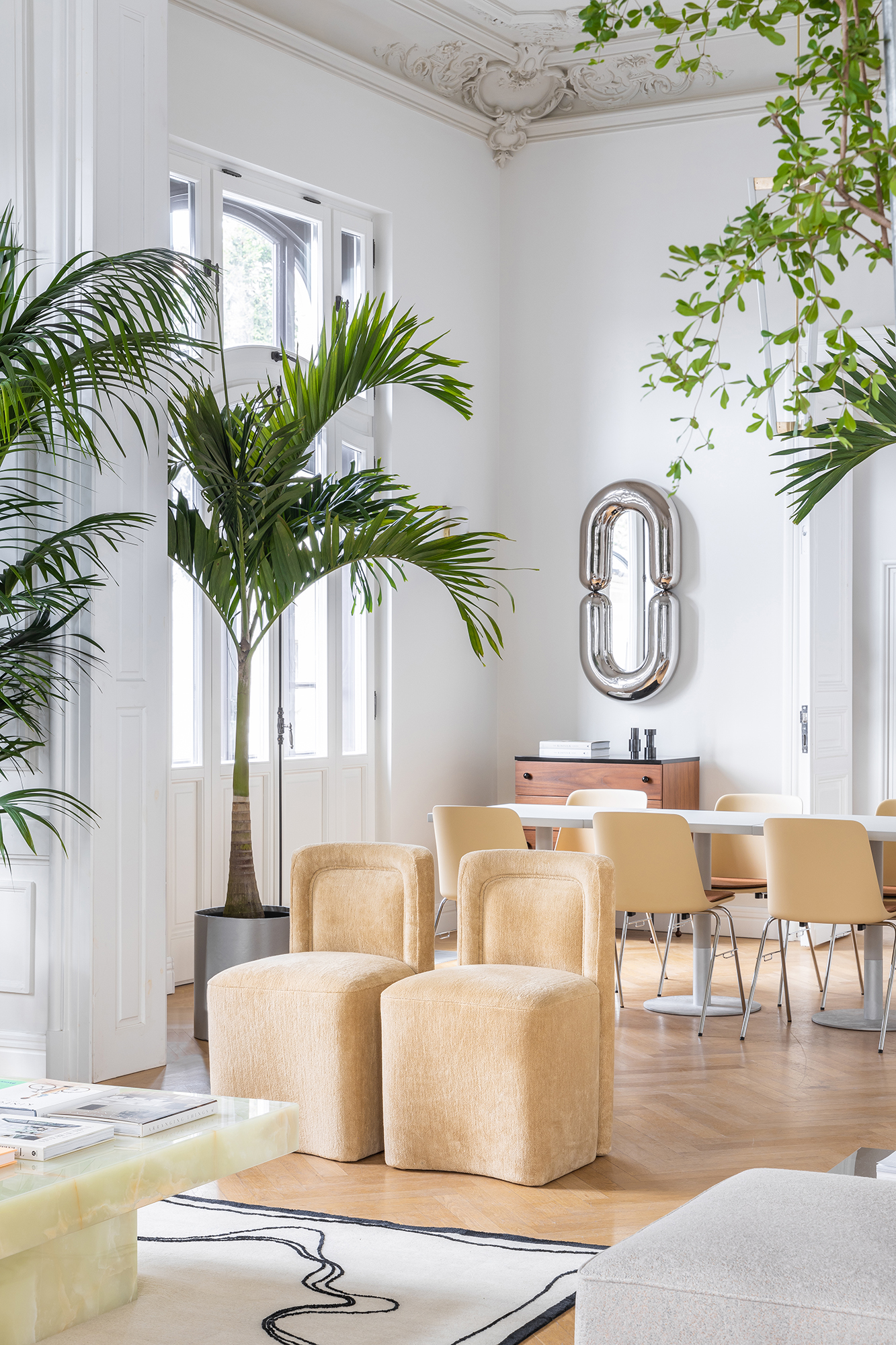 The plants also play a crucial role. The vegetation evenly distributed throughout the space gives texture and is meant to evoke the memory of the winter gardens of French palaces, and creates a dialogue with the rich floral motifs of the ceiling decorations.
